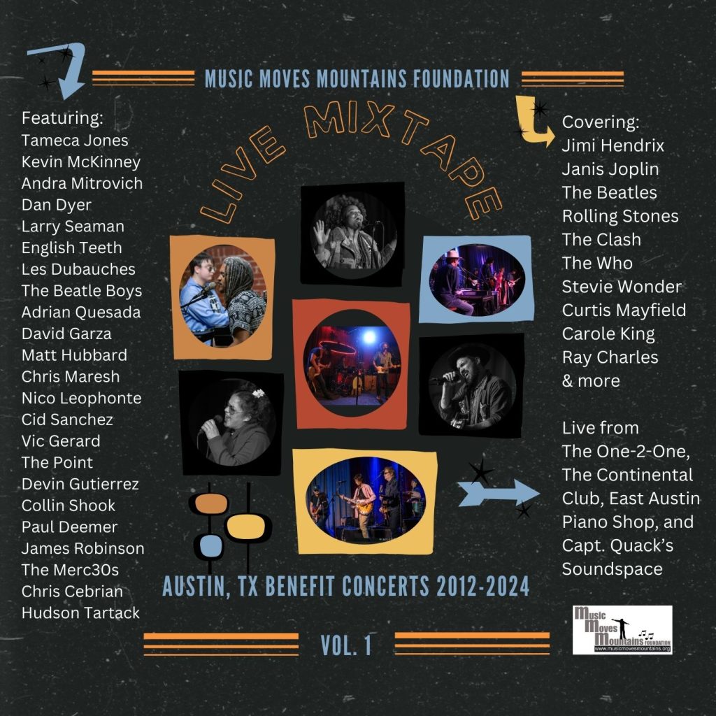 Available now on CD! MMMF’s Live Mixtape, Vol. 1! Donate $25 to receive this collection of 19 select tunes from the audio vault of previous Austin benefit concerts from 2012-2024 to help support MMMF’s programs! (Click on the cover for the link to donate. Available for shipping in the USA only.)