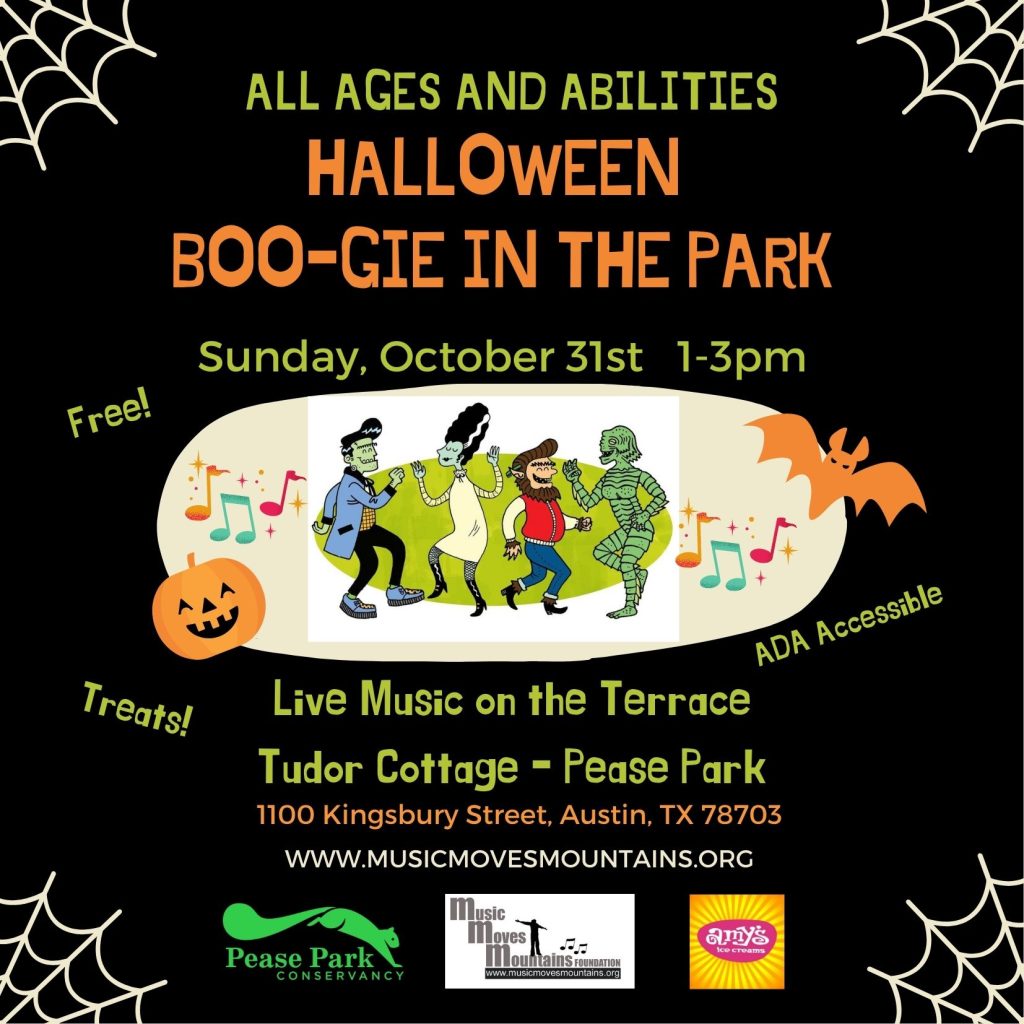 The Music Moves Mountains Foundation hosted a special sensory-friendly concert on October 31st, 2021 in Austin at Pease Park’s Tudor Cottage Terrace. The Old Souls along with boogie-woogie pianist Henri Herbert and MMMF sponsored artist Devin Gutierrez brought fun, family-friendly tunes to “Boo-gie” down to on Halloween. This concert series is designed for all ages and abilities to enjoy live music in a safe, accessible, and adaptable environment, Although Austin is known as the “live music capital of the world,” the special needs and disability community are often left out of the mix despite music’s massive impact on this vulnerable population. This concert series also provides the underserved an opportunity to access live music with no barriers or judgment and to celebrate diversity and inclusivity in an accepting, beautiful, and loving atmosphere.