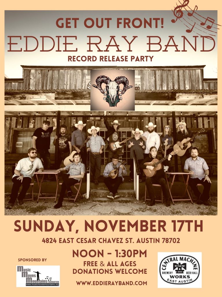 Austin, TX – The Music Moves Mountains Foundation is hosting the record release party for The Eddie Ray Band on Sunday, November 17th, 2024, from Noon to 1:30pm at Central Machine Works. This will be a free, all ages, family (and dog)- friendly event celebrating the beauty, diversity, and inclusivity of this special group of musicians with disabilities. As part of the MMMF’s All Abilities program, the Foundation is a proud sponsor of the band’s efforts to realize a dream of sharing their original music with the world. Central Machine Works is an Eastside gem (Beer Hall with full menu) located at 4824 East Cesar Chavez Street Austin, TX, 78702; accessible handicap parking in front with an additional parking lot off of East 5th Street; CENTRAL MACHINE WORKS (cmwbrewery.com) ; more details available at Eddie Ray Band Record Release Party Tickets, Sun, Nov 17, 2024 at 12:00 PM | Eventbrite