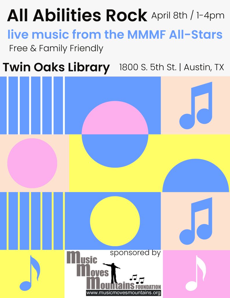 We are kickstarting Autism Awareness/Acceptance month off with another All Abilities Rock concert series event on Saturday, April 8th from 1-4pm at the Twin Oaks Library in Austin! More info here: All Abilities Rock with the MMMF All-Stars 4/8/23