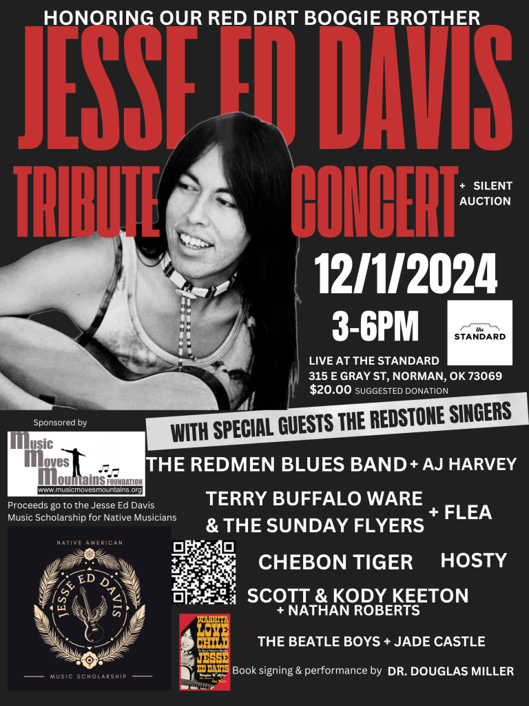 Norman, OK – The Music Moves Mountains Foundation is hosting a tribute concert to celebrate the late-great, local music hero Jesse Ed Davis on Sunday, December 1st, 2024 at The Standard from 3-6pm to raise funds for a music scholarship for Native musicians in his honor. The concert will bring together Oklahoma legends and Indigenous musicians including Terry Tsotigh & The Redmen Blues Band, AJ Harvey, Mike Hosty, Terry Buffalo Ware & The Sunday Flyers, Felix Linden (aka Flea), Chebon Tiger, Scott & Kody Keeton with Nathan Roberts, The Beatle Boys & Jade Castle, and special guests The Redstone Singers (Kiowa/Anquoe family drum group) who will open with a few traditional honor songs. Dr. Douglas Miller, the author of the upcoming Davis biography “Washita Love Child: The Rise of Indigenous Rock Star Jesse Ed Davis” and co-producer of an archival LP set of unissued music by Davis titled “Tomorrow May Not Be Your Day,” will be present to sign and sell copies as well as perform. MMMF will be accepting donations and offering silent auction items to support the scholarship fund and the bands. The Standard is a community-oriented, family-friendly restaurant and beer garden located at 315 E. Gray St., Norman, OK. For those who are unable to attend, donations can still be made here Give « Music Moves Mountains Foundation .